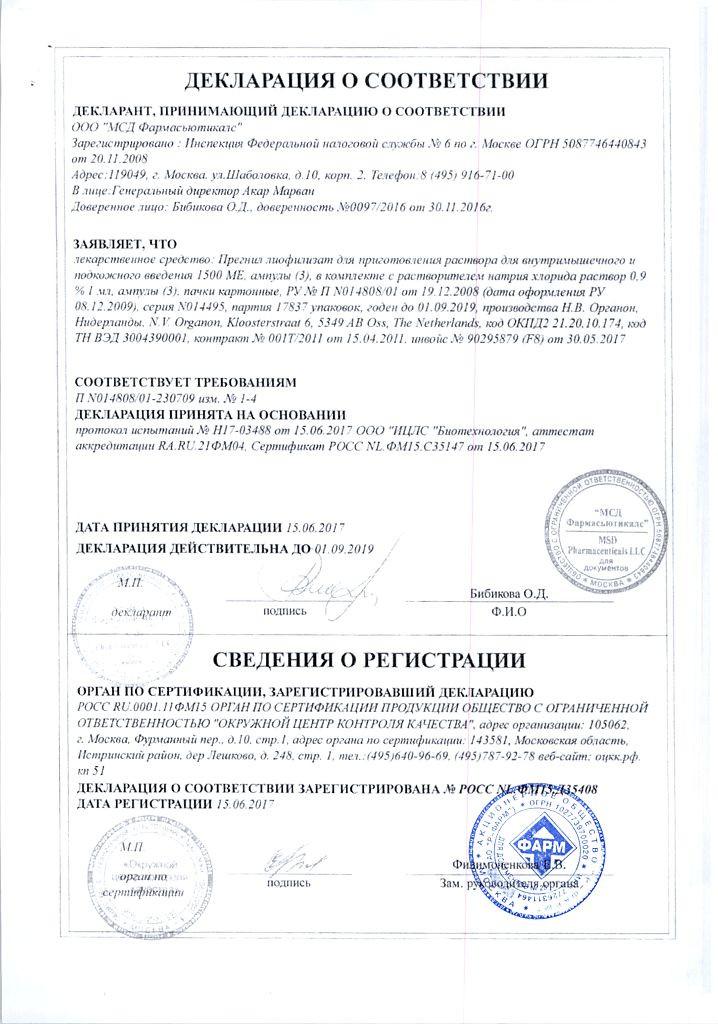 По 3 ампулы 1500 ME лиофилизата в комплекте с 3 ампулами растворителя, каждая ампула зафиксирована при помощи двух фиксаторов, помещают в картонную пачку вместе с инструкцией по применению.