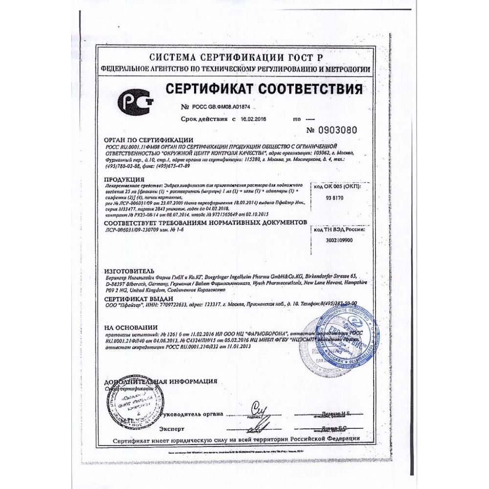 Аккуратно, покачать флакон круговыми движениями для растворения порошка. Не встряхивать флакон. Подождать до полного растворения порошка (обычно меньше 10 мин). Раствор должен быть прозрачным или немного опалесцировать, он может быть бесцветным или бледно-желтым, без комков, хлопьев или частиц. Некоторое количество пены может остаться во флаконе - это допускается.