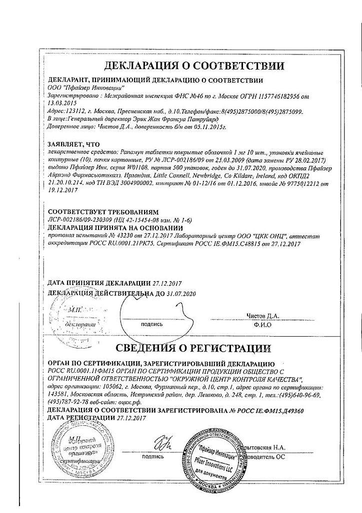 Таблетки, покрытые оболочкой белого цвета, треугольной формы, с маркировкой красного цвета "RAPAMUNE 1 mg".