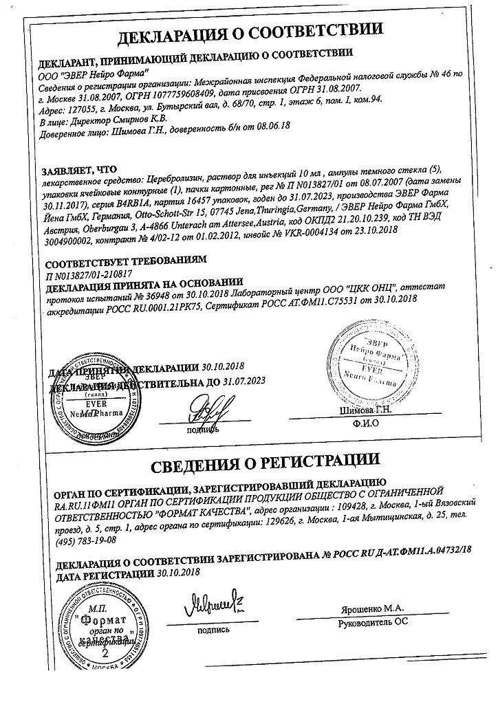 Церебролизин - ноотропный препарат. Способствует улучшению обмена веществ в мозговой ткани. Церебролизин содержит биологически активные аминокислоты и пептиды, являющиеся основными звеньями мозгового метаболизма. Церебролизин повышает эффективность аэробного энергетического метаболизма мозга, улучшает внутриклеточный синтез белка в развивающемся и стареющем головном мозге. Нейропротекторное действие проявляется в защите нейронов от повреждающего действия лактацидоза, препарат предотвращает образование свободных радикалов, повышает переживаемость и предотвращает гибель нейронов в условиях гипоксии и ишемии, снижает повреждающее нейротоксическое действие возбуждающих аминокислот.