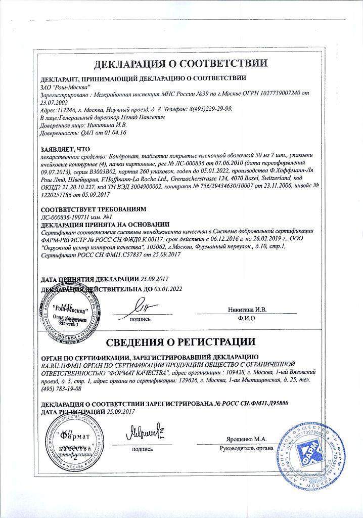 Применение. Таблетки Бондронат принимают внутрь не менее чем за 30 мин до первого в этот день приёма пищи или жидкости (кроме чистой воды) или других ЛС и БАДов. Рекомендованная дозировка – 1 таблетка 50 мг 1 раз в сутки. Таблетки следует глотать целиком, не разжевывая, запивая стаканом обычной воды (180 - 240 мл). Пациентам не следует лежать в течение 60 мин после приема препарата Бондронат