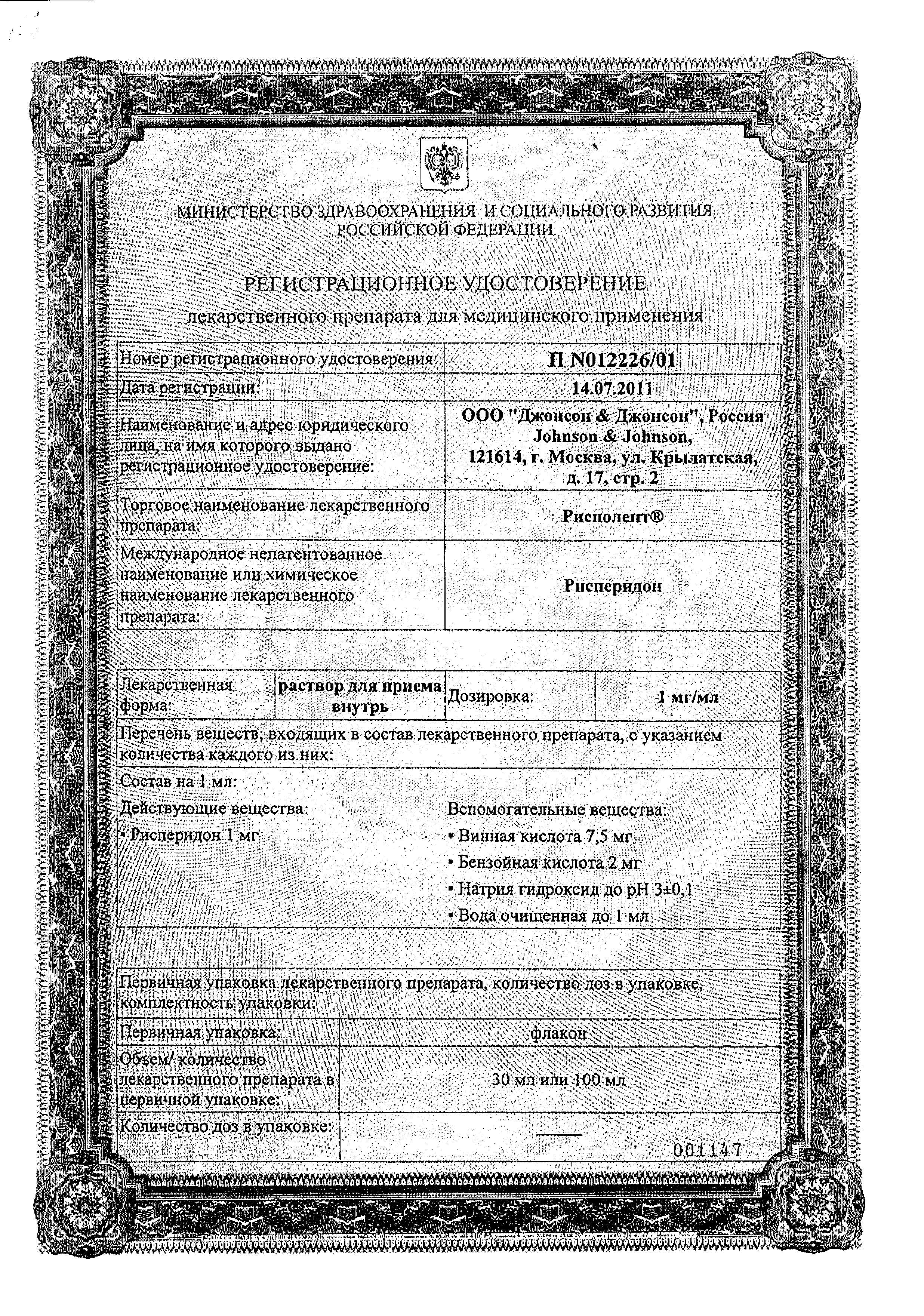 Начальная доза препарата Рисполепт® – 2 мг в сутки. На второй день дозу можно увеличить до 4 мг в сутки. С этого момента дозу можно либо сохранить на прежнем уровне, либо индивидуально скорректировать при необходимости. Обычно оптимальной дозой является 4-6 мг в сутки. В ряде случаев может быть оправдано более медленное повышение дозы и более низкая начальная и поддерживающая дозы.