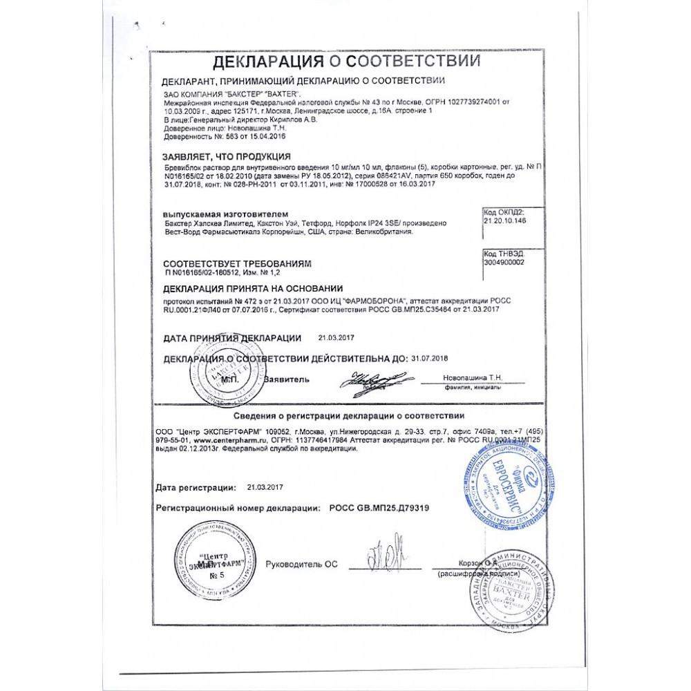 Бревиблок раствор для инфузий в контейнере с двумя ПВХ-отверстиями (портами) - порт для извлечения первичной нагрузочной дозы (самозакрывающийся, полиизопреновый) и порт для инфузии препарата (подсоединения инфузионной системы).